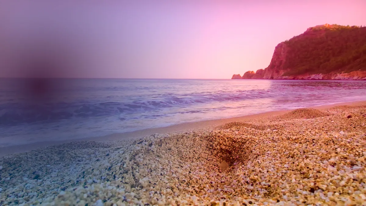 Романтический вид на море и знаменитый пляж Клеопатры в утренних лучах. Волны мягко обнимают берег, создавая атмосферу благодати, спокойствия и умиротворения, погружая в мир расслабления и тишины.