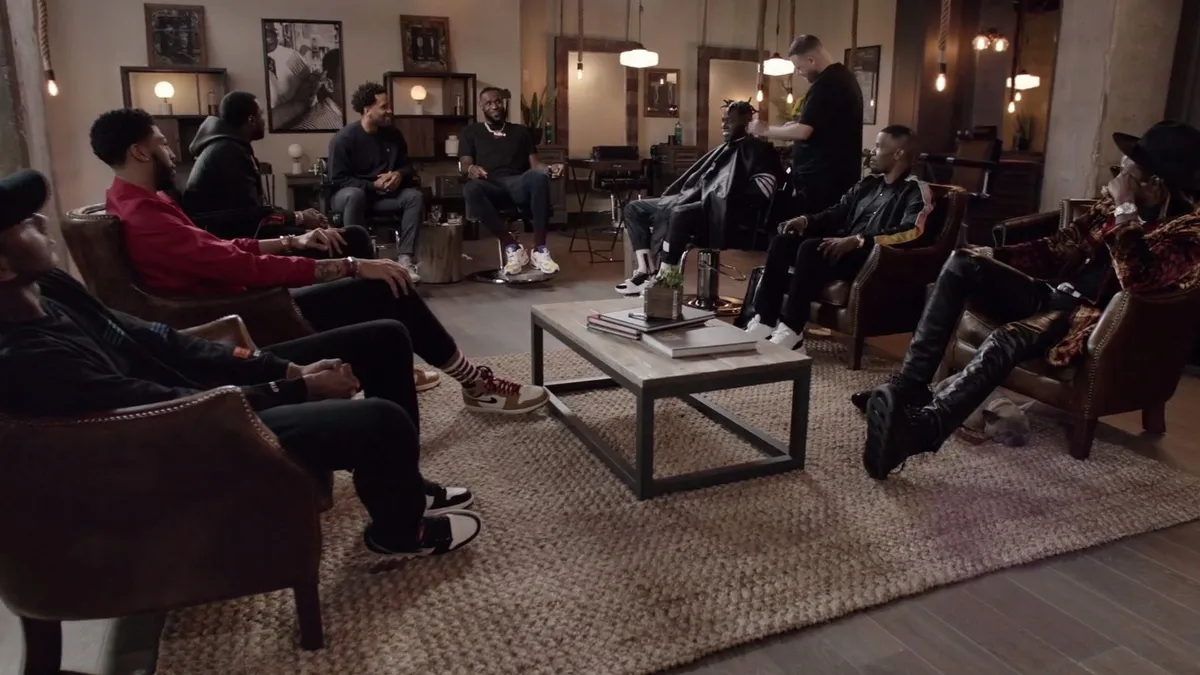 В креслах барбершопа — Леброн Джеймс, Мэверик Картер, губернатор Калифорнии Гэвин Ньюсом, Дидди, Рич Пол, Демар Дерозан, Рик Рубин, Билл Хейдер и Джеррод Кармайкл. От политики до музыки — разговор без микрофонов и официальных речей.