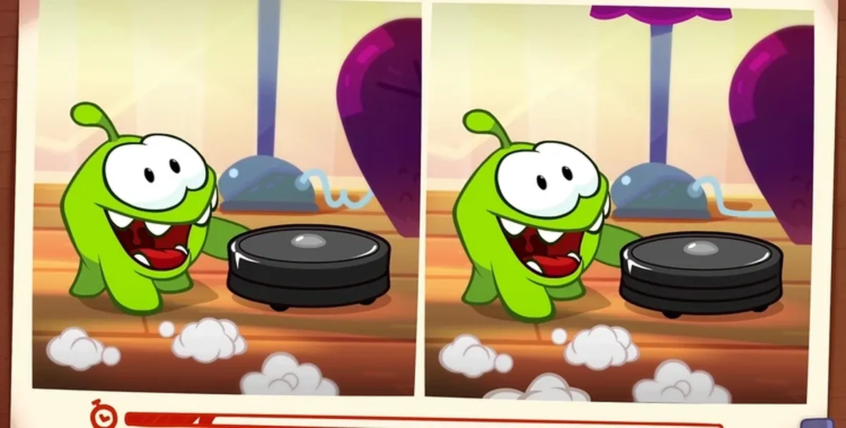 Ам Ням попал в каменный век! Пока зеленый монстрик ищет древние сладости, ты можешь найти несколько отличий на двух кадрах.