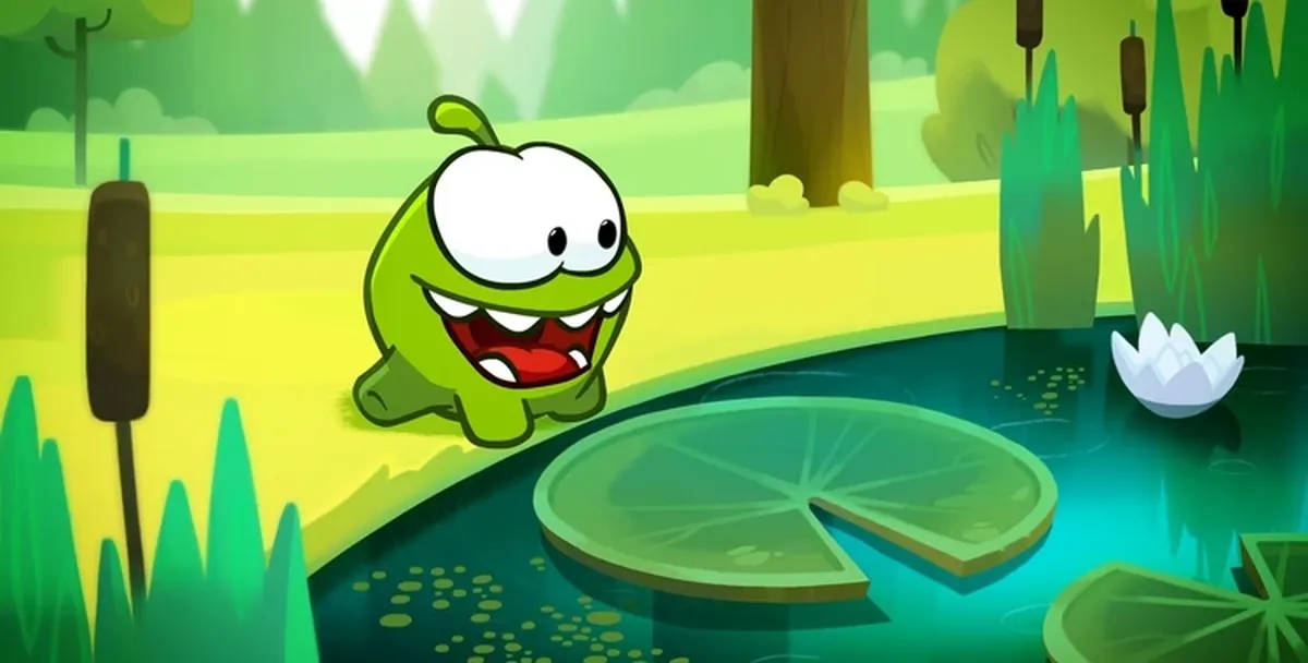 В лесу Ам Ням встречает жёлтого Няма с пропеллером, который помогает зелёному малышу достать конфету из листвы высокого дерева.